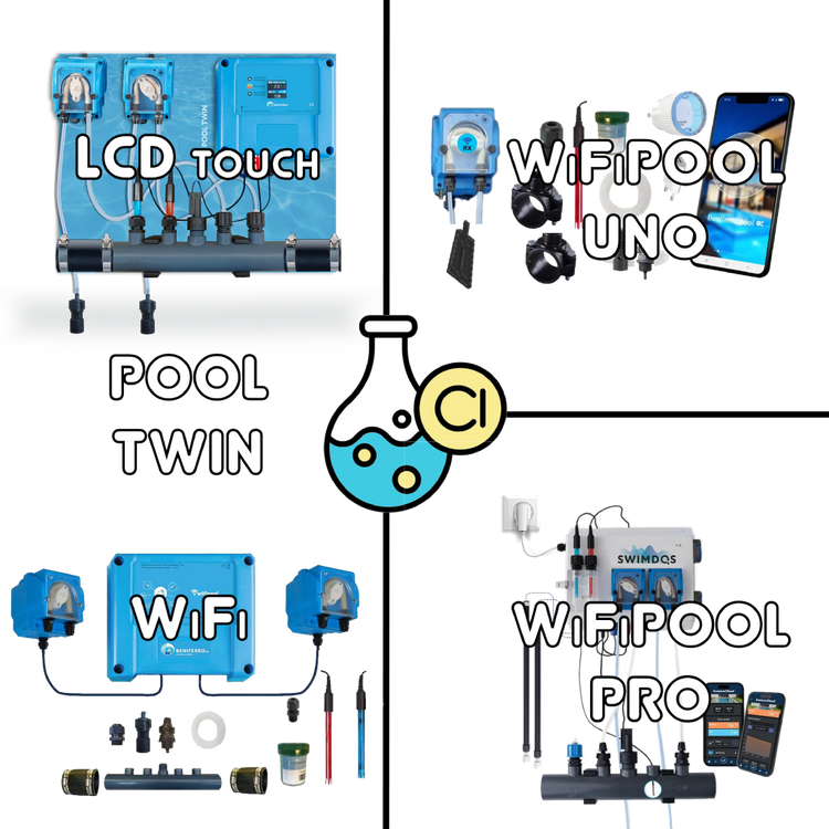 Vores sortiment består af plug&play eller gør-det-selv klor inkl. pH-doseringsapparater (POOL TWIN) eller gør-det-selv separate klor- og pH-doseringspumpen (WiFiPOOL UNO).