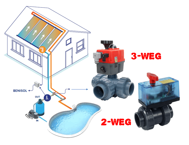 I svømmebassininstallationer bruges motoriserede kugleventiler især til solvarmeanlæg. Ventilen sørger for, at vandet KUN strømmer gennem solmåtte, når solen skinner, og IKKE når det regner eller er koldt. Disse ventiler bruges også til niveauregulering af overløbsbassiner.