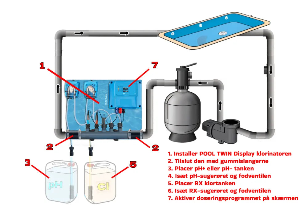 Alt tilbehør til installation og brug (sonder, kalibreringsvæske, manual ...) medfølger. De normale brugsbetingelser (pH 7,2-7,6, Redox > 700 mV) er allerede forprogrammeret i apparatet.