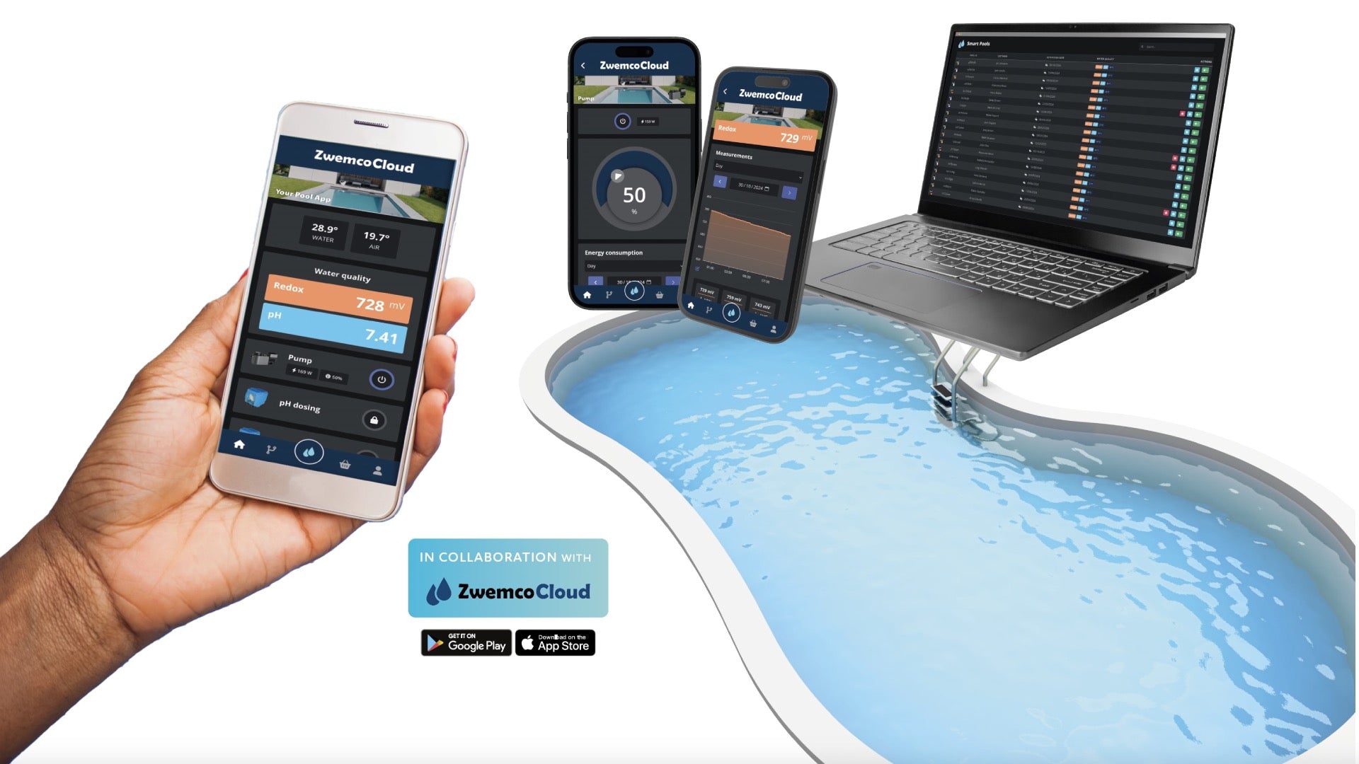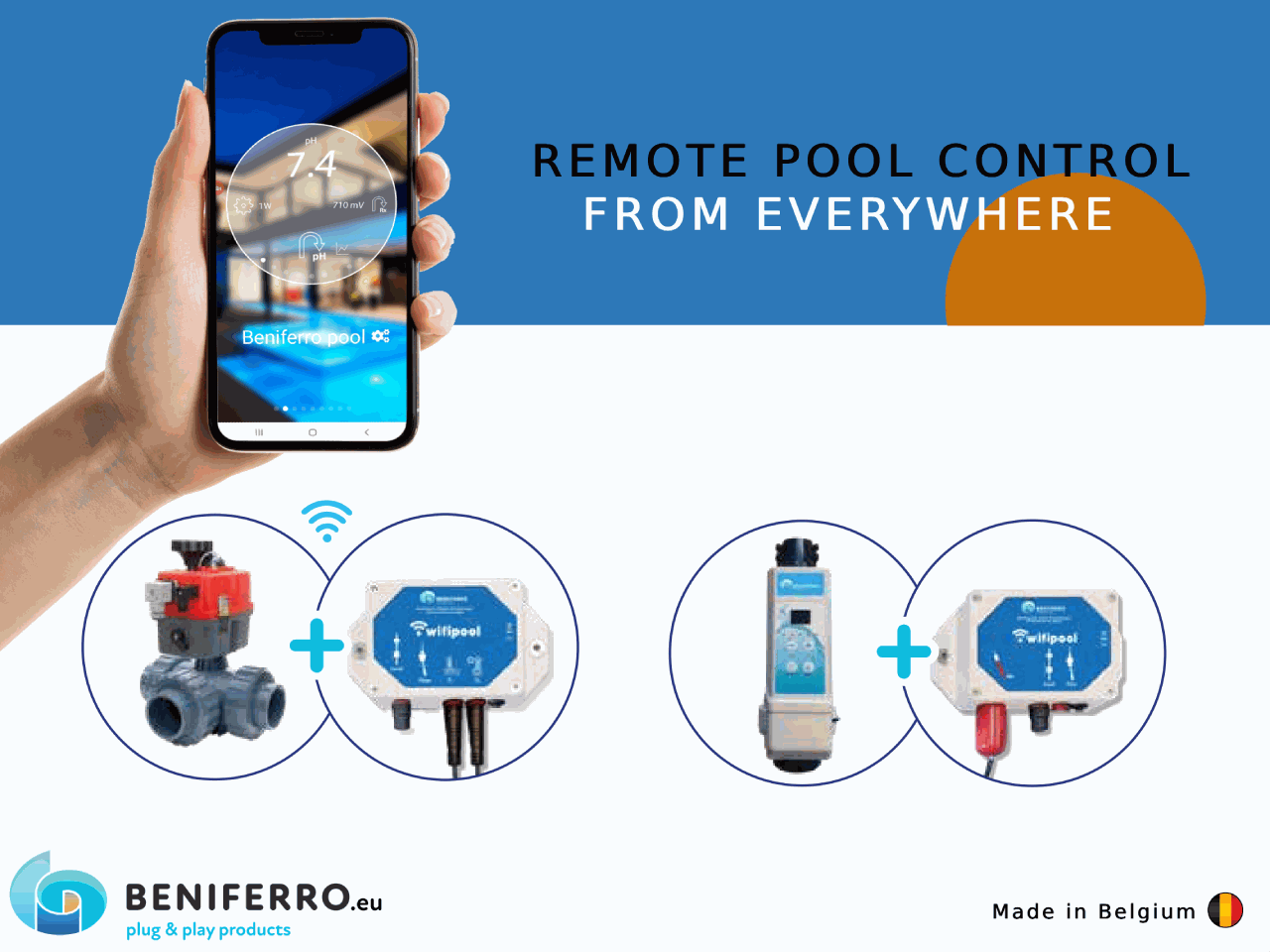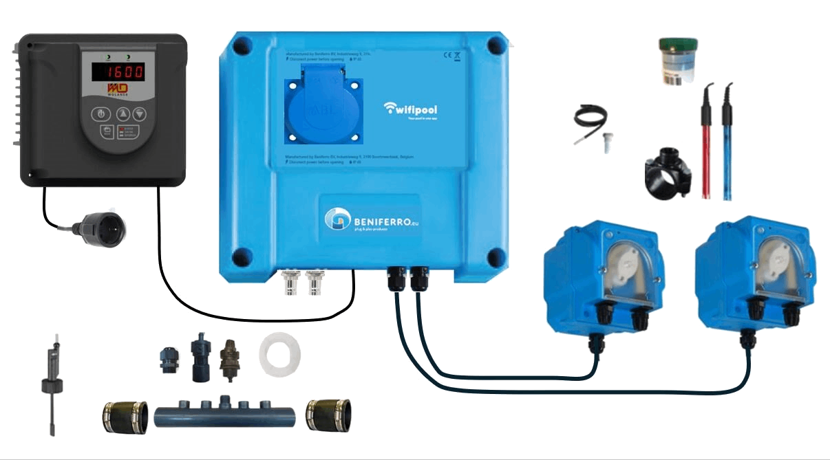 Via WiFiPOOL-app er det muligt at se forskellige parametre såsom temperatur, pH, klor, filterpumpeforbrug osv. på mobiltelefonen. Derudover er det muligt at styre svømmebassinet. Afhængigt af de betingelser, der er indstillet i appen, tændes eller slukkes pumper, varmeapparater, vandbehandlingsapparater osv.