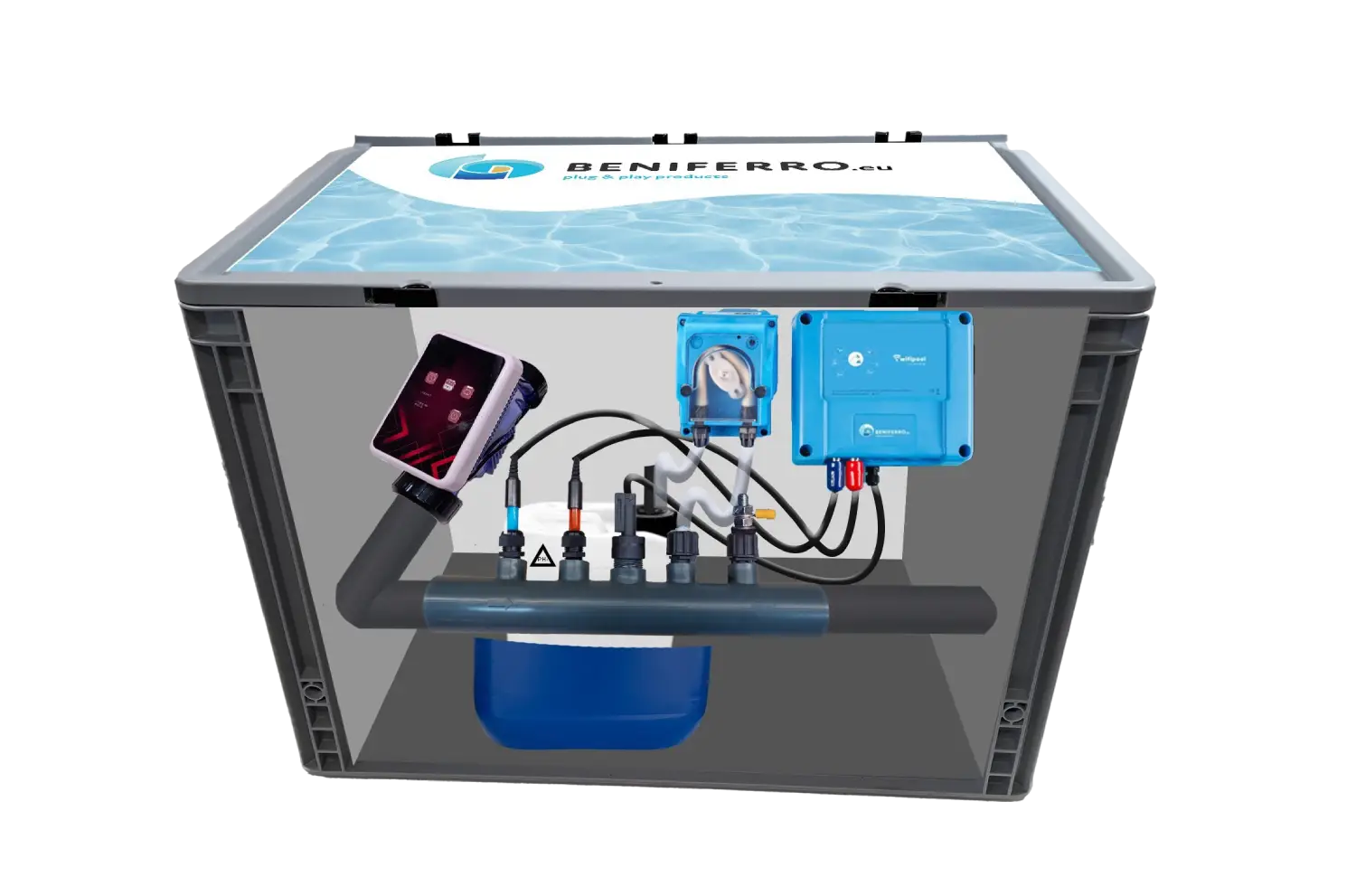 Zoutelektrolyse SR voorgemonteerd in box met PH-, RX- en debiet regeling - zwenbad tot 150m³ - WiFi | Display - Niveau regeling in optie